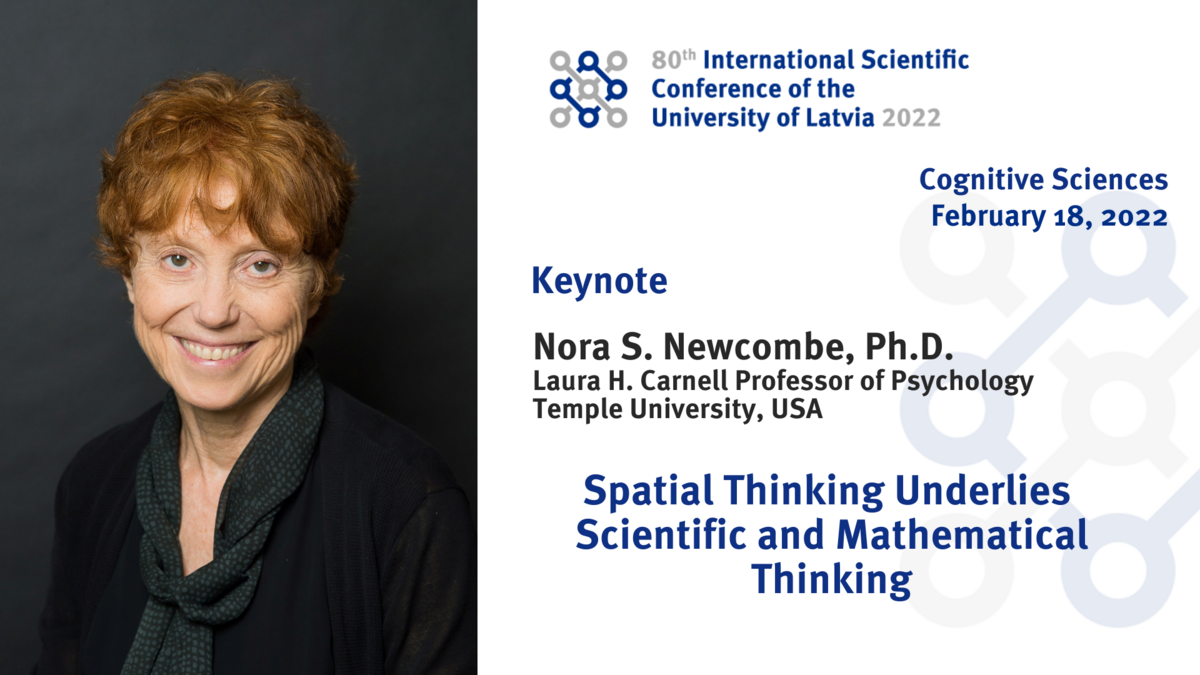 Piektdien, 18. februārī, plkst. 17.00 Latvijas Universitātes 80. ikgadējās starptautiskās konferences sekcijā “Kognitīvās zinātnes” ar ielūgto referātu “Spatial Thinking Underlies Scientific and Mathematical Thinking” uzstāsies viena no pasaulē vadošajām telpiskās uztveres un vecumposmu pētniecēm – profesore Nora Ņūkomba.
